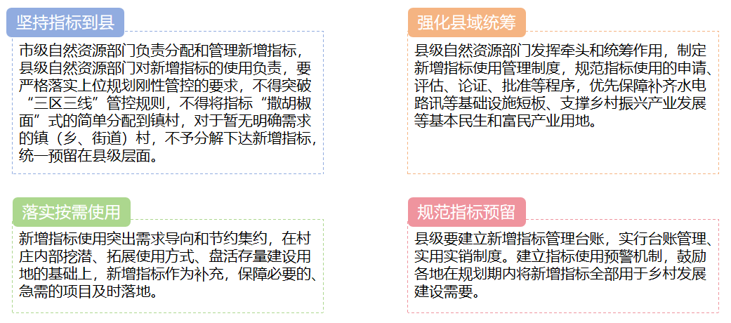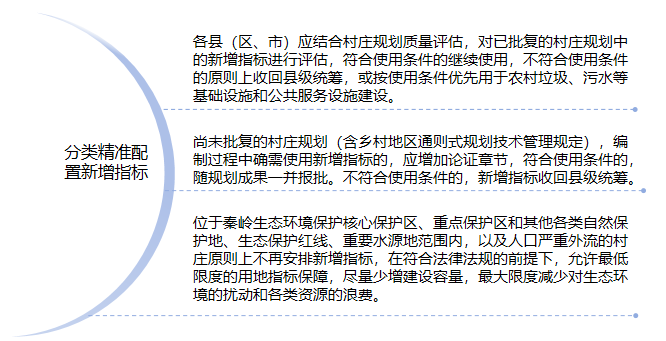 為切實加強國土空間規(guī)劃實施管理,嚴格實施國土空間用途管制,精準發(fā)揮新增農(nóng)村建設用地指標對鄉(xiāng)村振興支撐保障作用。陜西省自然資源廳于2024年12月下發(fā)了《關于規(guī)范國土空間規(guī)劃中新增農(nóng)村建設用地指標使用的指導意見》(試行),對新增農(nóng)村建設用地指標使用提出了指導意見:
